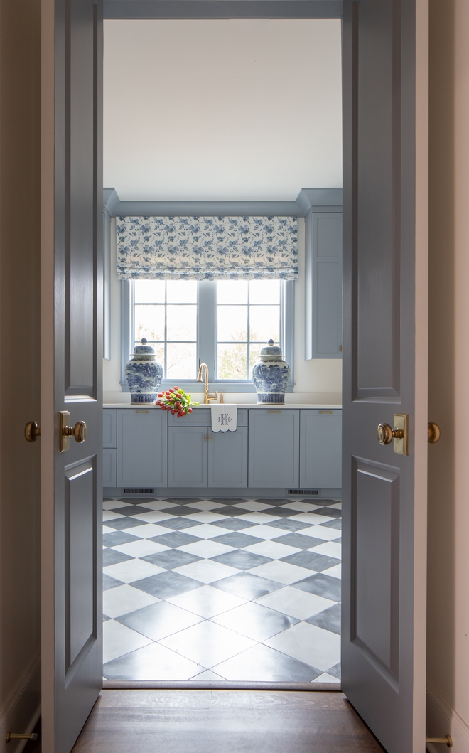 “This pantry was a place to have a little play on pattern. At the very end of the construction process we decided weβd use the remaining gray and white marble tile floor from the laundry room here to give a fun transition from the kitchen into this space and added a last-minute floral wallpaper and contrasting ceiling to give that extra detail. We love the way this space reflects the true Southern culture using a mix of textures and patterns.”