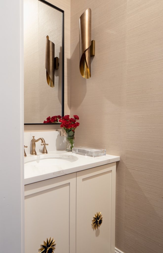 “This formal powder bath took shape on its own once the wall mural was selected. We wanted this space to feel timeless and classic and give a sense of sophistication through its details. We incorporated the reeded detail used in other places of the home on the sink vanity to help create cohesiveness from one space to another.”