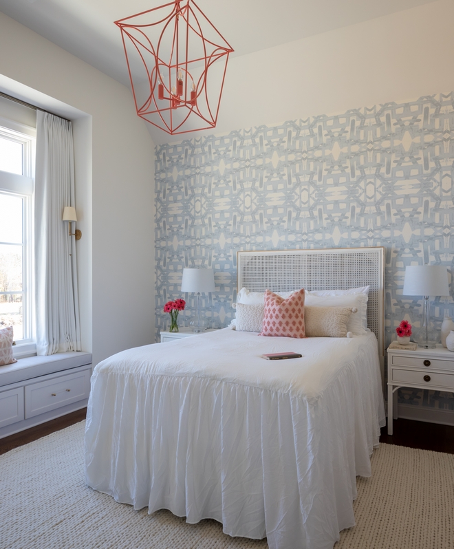 “This room started with the wallpaper where we used a fun and whimsy print created by Lindsay Cowles. It screamed the personality of the little girl who calls this room hers and we continued to create a fun and whimsy space by incorporating a coral chandelier to contrast the paper.“