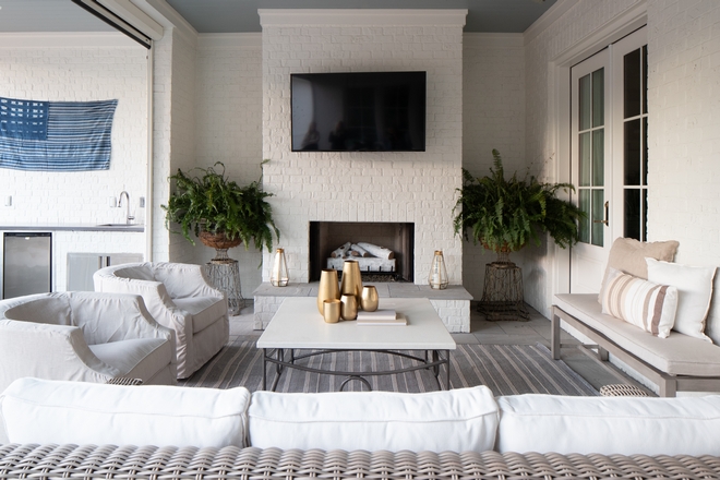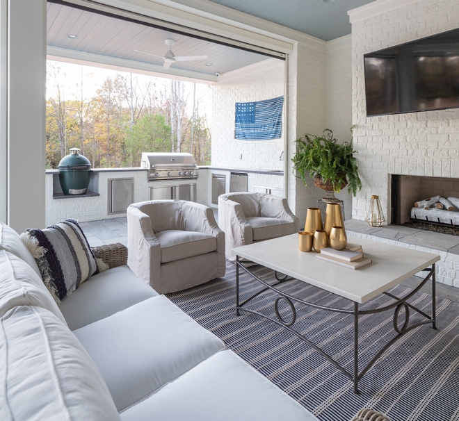 “The outdoor space in this home is one that anyone would be envious of. We knew we had to create a space that the homeowners would be able to utilize during any season. We accomplished this by designing a seating area that accommodates multiple people. We brought the blue accent color into this space by painting the ceiling in a soft blue tone and using a navy area rug in the seating area to help tie the indoors with the out. Pops of navy were also incorporated through the pillows used on the sofa and swing.”