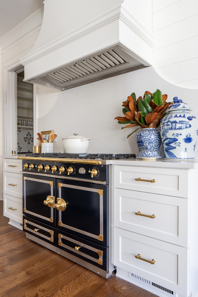 “The kitchen in this home is where it all started. We saw the Navy, La Cornue Range, in a random advertisement and knew it was love at first sight. We spoke with the homeowner and selected this range first and the rest of the house fell into place. From the navy range to the accenting stand-alone cabinetry with antiqued mirror we knew this direction was going to give a clear vision to the rest of the home.”