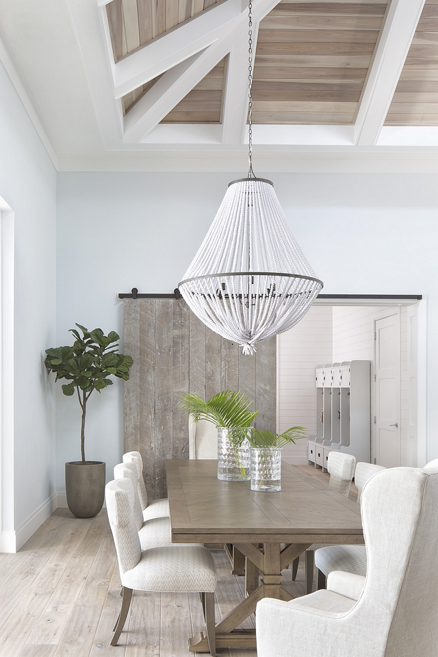 Shiplap clad ceilings, oversized barn door, soaring beamed ceilings, seamless transition outdoors with large pivot sliders, wide plank French Oak flooring, and water views from just about every room make this home a stunning example of the interior design from Krista Watterworth Alterman of Krista + Home.