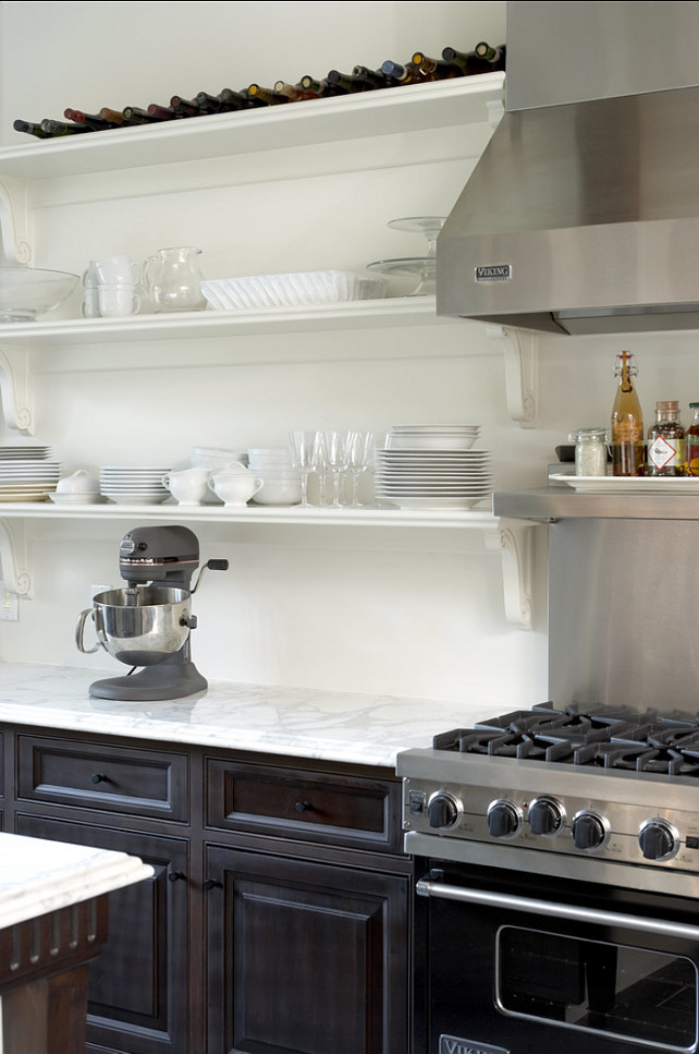 The deep, richly stained dark cabinets beautifully contrasts with the crisp white open shelves.