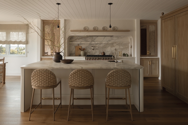 The kitchen continues the home’s warm neutral palette with cabinetry painted in Benjamin Moore Ballet White OC-9. White oak cabinets with antique mirror doors add texture and personality, while the range alcove with a marble slab backsplash creates a timeless focal point.