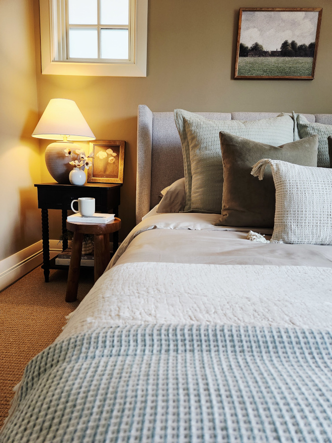 Above the upholstered bed, a Hampton Court Green by Camille Pissarro art print sets the tone for the room, inspiring the soft greens and earthy hues that bring a calm, nature-inspired feel indoors. I feel at peace every time I look at it.
