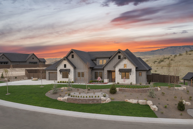 What a curb appeal and what a view! Sherwin Williams Urbane Bronze SW 7048 on the fascia and corbels adds depth and contrast against the Gauntlet Gray siding and natural stone.