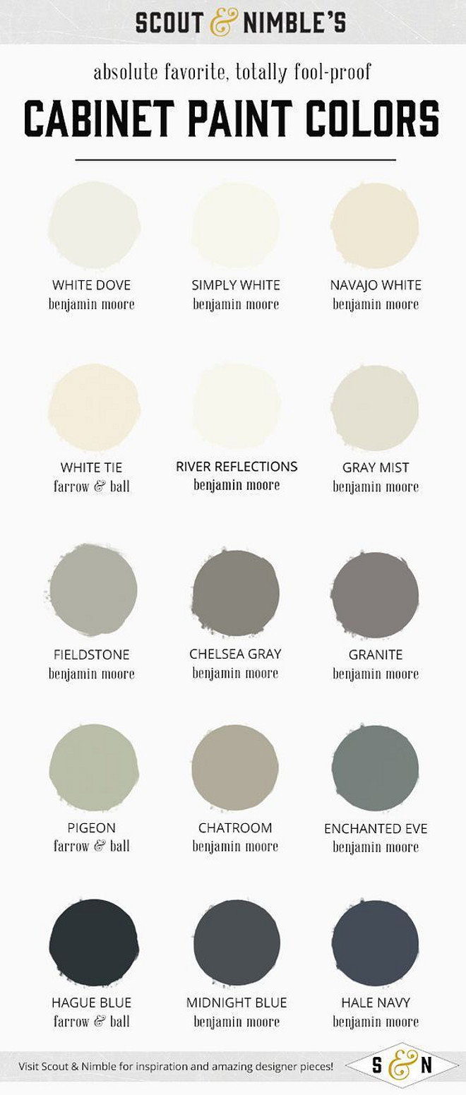 Fool-proof cabinet paint colors for kitchens and bathrooms: Benjamin Moore White Dove. Benjamin Moore Simply White, Benjamin Moore Navajo White. Farrow and Ball White Tie, Benjamin Moore River Reflections, Benjamin Moore Gray Mist, Benjamin Moore Fieldstone, Benjamin Moore Chelsea Gray, Benjamin Moore Granite, Farrow and Ball Pigeon, Benjamin Moore Chatroom, Benjamin Moore Enchanted Eve, Farrow and Ball Hague Blue, Benjamin Moore Midnight Blue, Benjamin Moore Hale Navy.
