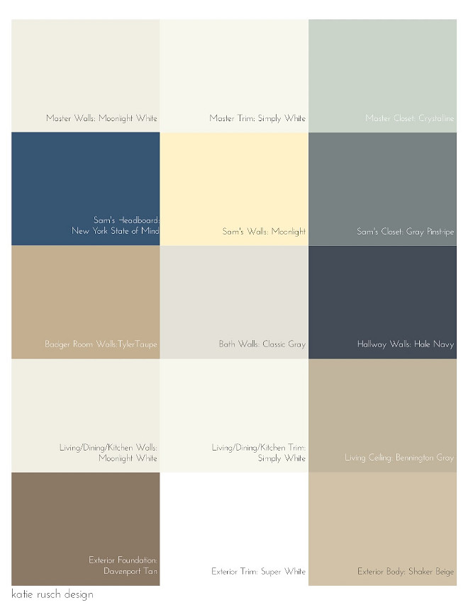 Interior and Exterior Whole House Paint Color Palette: Master Bedroom: Benjamin Moore OC-125 Moonlight White. Trim Paint Color: Benjamin Moore Simply White. Master Closet: Benjamin Moore Crystaline. Boy Bedroom Accent Wall: Benjamin Moore New York State of Mind. Boy Bedroom Paint Color: Benjamin Moore Moonlight. Closet Paint Color: Benjamin Moore Gray Pinstripe. Mudroom Paint Color: Benjamin Moore Tyler Taupe. Bathroom walls: Benjamin Moore Classic Gray. Hallway Paint Color: Benjamin Moore Hale Navy. Living room, dining room, kitchen walls: Benjamin Moore Moonlight White. Living room ceiling paint color: Benjamin Moore Bennington Gray. Exterior Paint Color: Exterior Foundation: Benjamin Moore Davenport Tan. Exterior Trim Paint Color: Benjamin Moore Super White. Exterior Siding Paint Color: Benjamin Moore Shaker Beige.