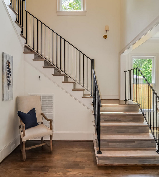 Staircase features shiplap paneling, stained oak handrail and oak stair treads.