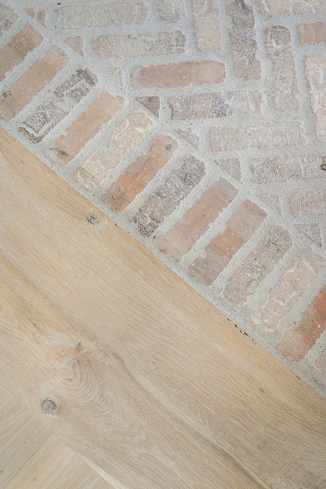 Brick installed in Herringbone pattern with a soldier course border. The brick flooring by Marvel Building & Masonry Supply.