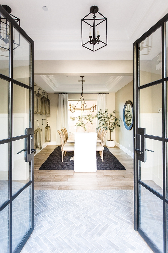 Black metal and glass French doors open to a foyer with herringbone brick flooring with direct view of a neutral dining room. Notice the hung lanterns! Isn’t it a fun idea?