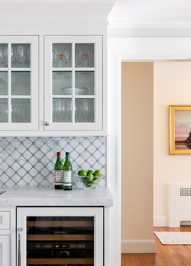 The kitchen wet bar features paneled refrigerator and freezer drawers, wine cooler and plenty of storage. I love this classic look.