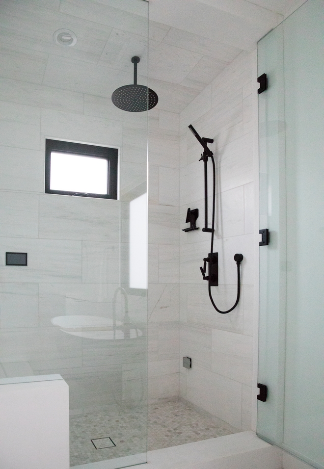 I am loving the tile combination in this shower. It looks even crispier when accentuated with a dark Quartz bench and shower frame.