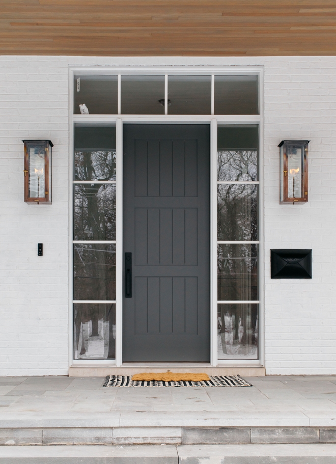 Front Door: Sherwin Williams SW 7068 Grizzle Gray on the door and Sherwin Williams Nebulous White on sidelights.