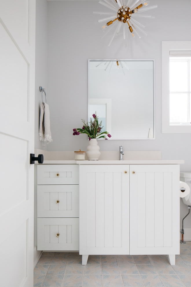 Beadboard Cabinet Paint Color: Benjamin Moore White Heron.