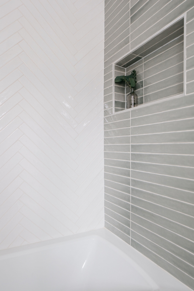 Bath Tile: Gray & White Tile in “straight stacked horizontal” pattern and “herringbone” pattern.