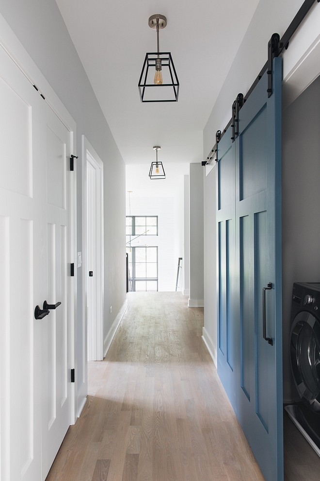 Second floor doors are painted in Sherwin Williams Extra White SW 7006 – except the barn door. Walls are Sherwin Williams SW 7070.