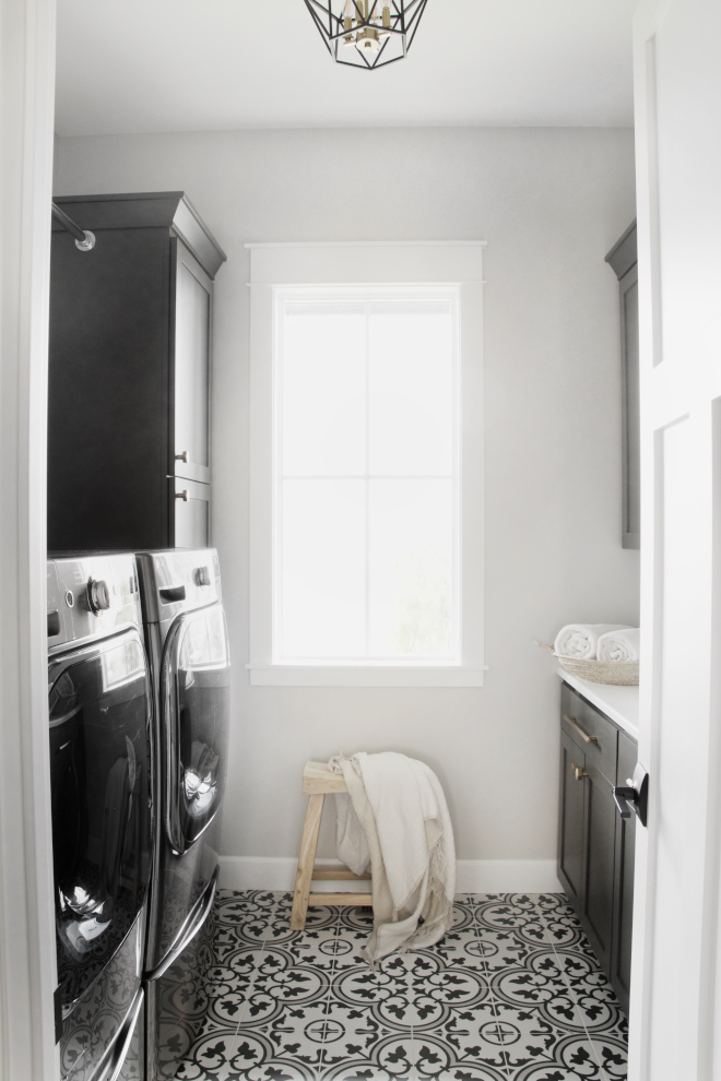 The Laundry room is located on the main floor. Wall color is Sherwin Williams Agreeable Gray.