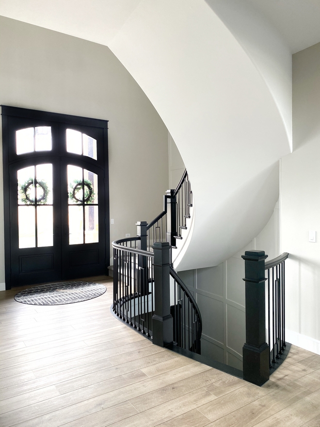 Staircase railing and posts are in Sherwin Williams Tricorn Black.