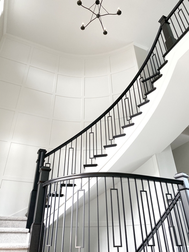 The black staircase railing is beautifully contrasted by a custom grid Board and Batten accent wall.