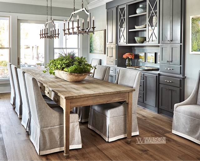 This gorgeous dining room features gray walls, painted in Sherwin Williams Silver Strand, wide plank hardwood floors and double chandeliers. The custom hutch cabinet is painted in Sherwin Williams SW 7067 Cityscape.