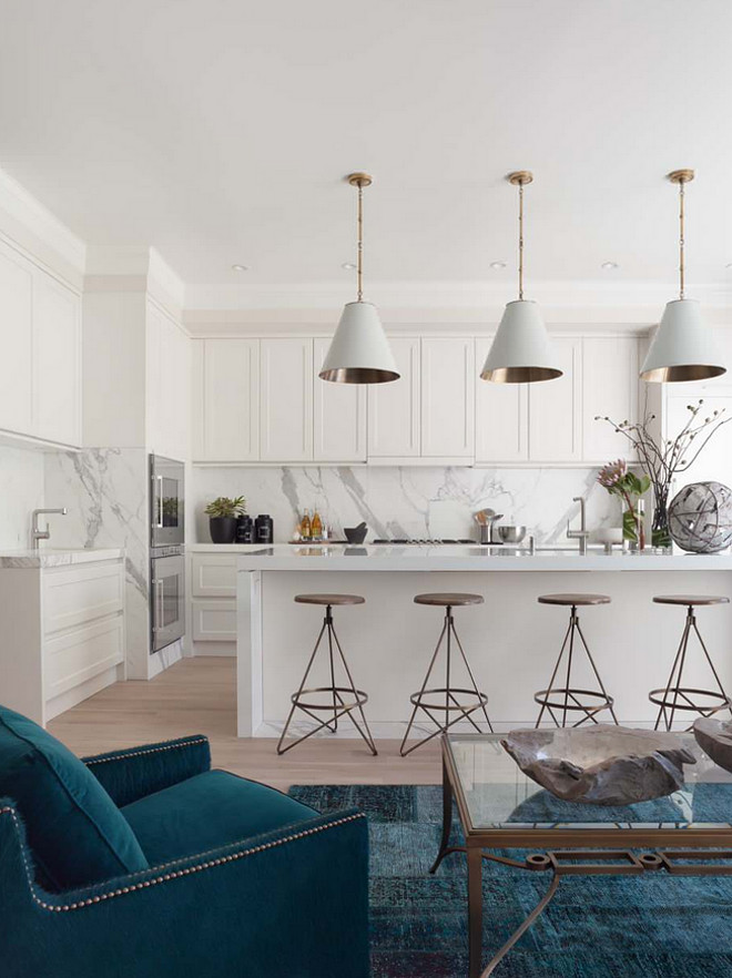 {This kitchen, painted in Benjamin Moore Ballet White OC-9, features four Arteriors Wyndham Swivel Brass Bar Stool. Designer: Green Couch Interior Design.}