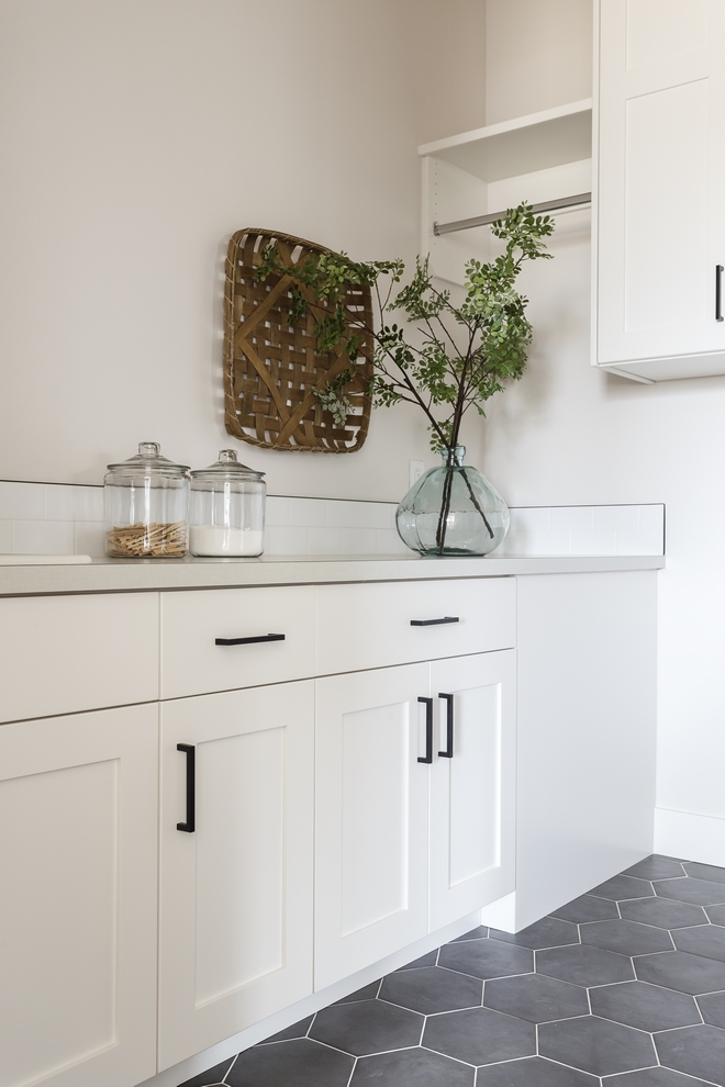 The Laundry room features a neutral color scheme and trendy concrete-look hexagon tile.