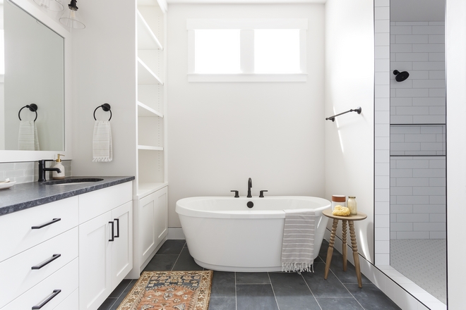 Vanity: Custom, in Sherwin Williams Snowbound – Other Vanities: here, here, here, here & here.