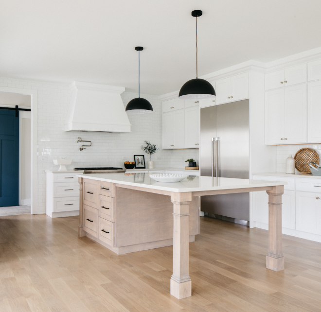 A custom barn door conceals a large walk-in pantry. Barn door paint color is Tempe Star by Sherwin Williams.