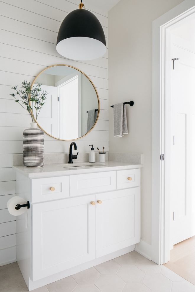 Featuring shiplap accent wall and large Hex floor tile, this bathroom feels trendy and welcoming at the same time. Shiplap paint color is Extra White by Sherwin Williams and remaining walls are Benjamin Moore OC-52 Gray Owl.
