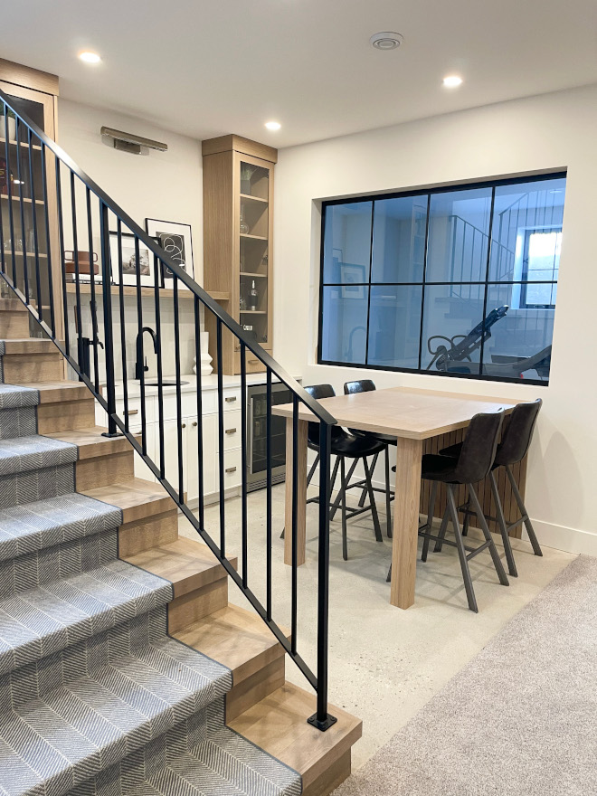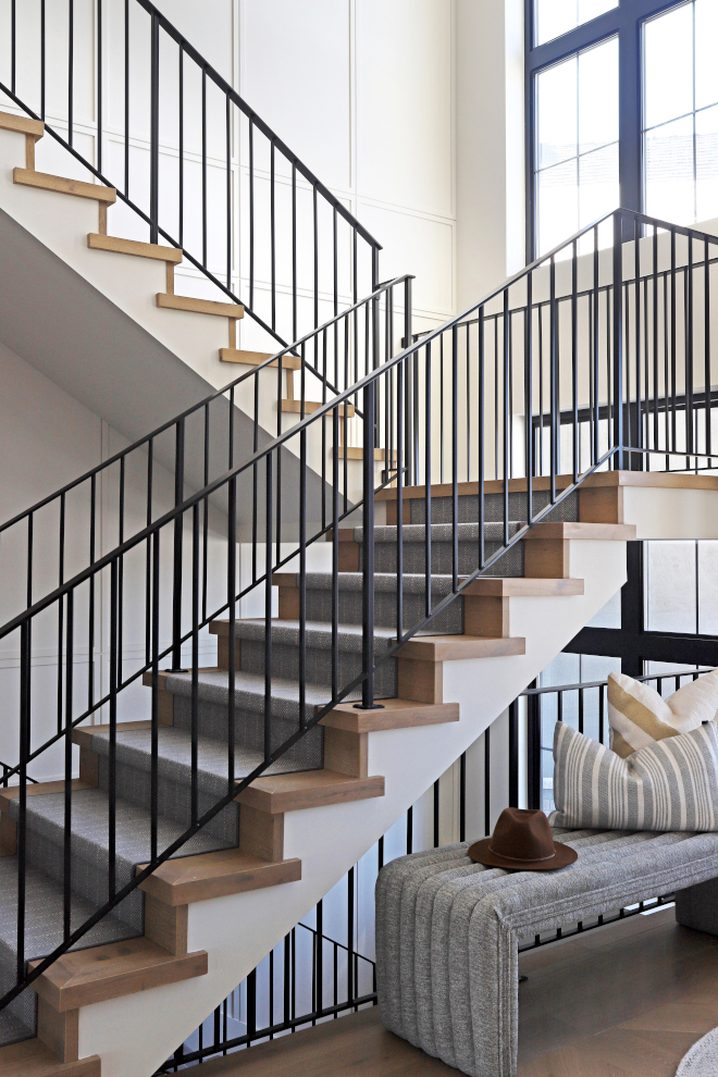 “The staircase, notable for its generous width and size, is complemented by smooth steel matte black handrails that add to the sleek modernity of the space. Adding a touch of comfort, an integrated wool stair runner graces the steps, offering both style and practicality. A large window floods the area with natural light, infusing the space with an airy ambiance, offering a refined contrast.” – Citizen Design Co.