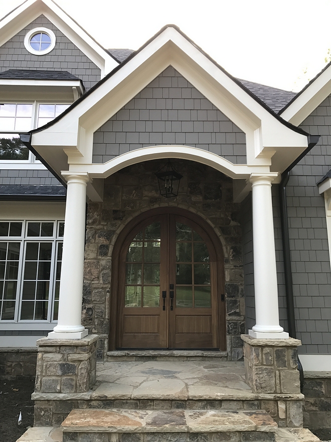 This newly-built home features gorgeous roof lines, transoms and round windows.