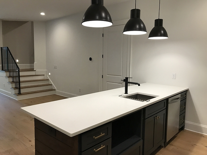 The basement features plenty of space and a great bar/kitchenette. Paint color is Benjamin Moore Collingwood .