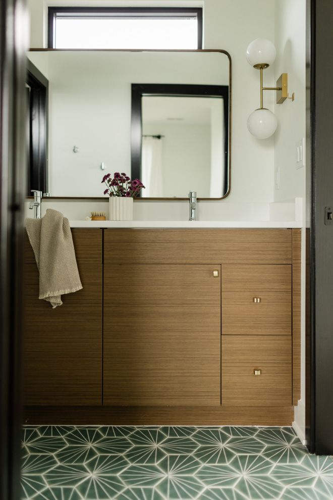 “We’re sharing part 1 of our install from a project where our team got to not only design the home, but furnish the spaces as well. In this first phase we focused on the pantry and some of the bathrooms. Our client wanted clean lines and an overall a modern aesthetic, but with a warm and homey feel for her family. By adding in earthy green tones, white oak accents, and textures with the roman clay and other materials, we were able to deliver Oakstone’s version of modern design.” – Katelyn Cheek for James May