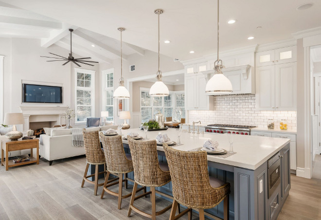 The family room opens to a spacious white kitchen with grey island. The kitchen cabinet paint color is Sherwin Williams Extra White SW-7006.