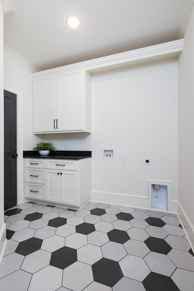 The laundry room features large hex floor tile and custom cabinetry. Paint Color is Benjamin Moore Dove Wing 960.