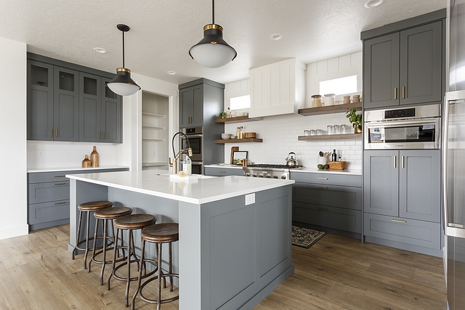 This grey kitchen sets the tone of this gorgeous home. You really can’t call it boring or a cookie-cuter, right?! Cabinet paint color is Sherwin Williams SW 2848 Roycroft Pewter.