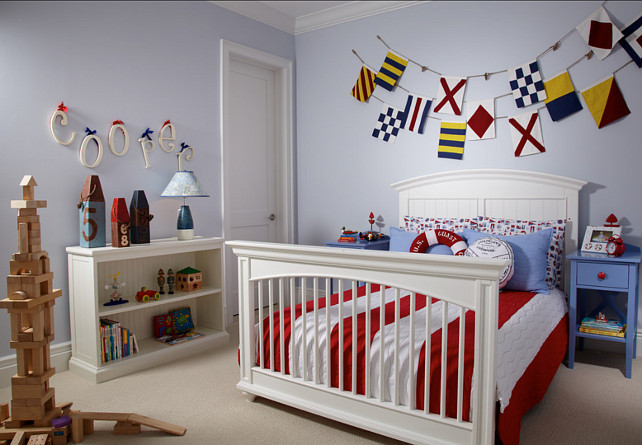 The curtain fabric is Justine Stripe in Dawn Blue/Oyster from Opuzen Design.