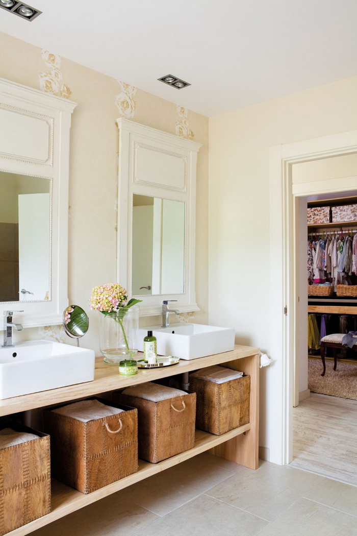 Modern and sleek! How great are these cow-hide baskets, right?! The architectural mirrors are from Artelore.