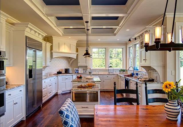 Light Fixture: Kichler Model 2943OZ , Cabinet Color: Sherwin Williams (Duron) Shell White, Pendants are from Kichler Lighting, 2665OZ, Chairs are from Keith’s Furniture in Newport, PA. The paint color in the coffers of the ceiling is Sherwin Williams Sporty Blue 6522 and the wall color is Sherwin Williams Patience 7555.