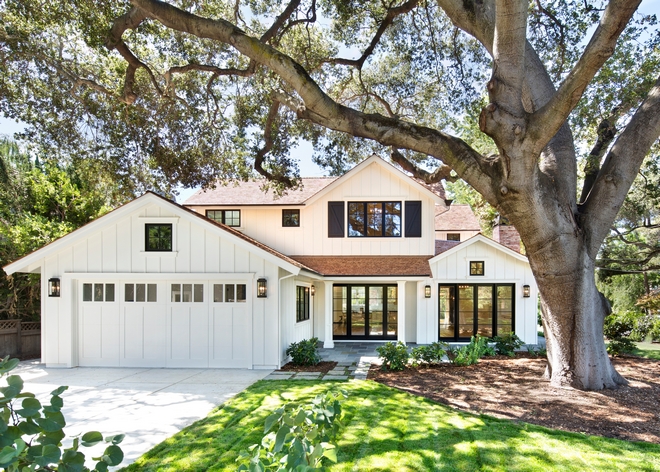 You probably know by now that I only share full house tours but the exterior of this Modern Farmhouse is so beautiful that I had to share it with you. Featuring off-white board and batten siding and black accents, along with a brick chimney, this home feels classic and current at the same time.